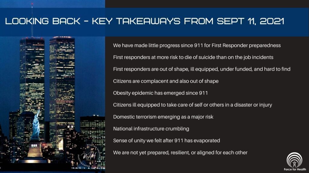 We can thrive in COVID. We can thrive after this Afghanistan thing. We can thrive, hoping our refugees, that are appropriate to stay in the country, to do well and, helping them settle elsewhere in the world as well. We can help make it a better place by being ordinary people in extraordinary times. You know guys, we’re in a slow motion 911 disaster. I did this in front of this backdrop behind me, the size of maybe 10 football fields. That’s it one day. Okay. We had the Pentagon, you know, bless those guys there. We had Shanksville Flight 93. This was a pinpoint strike in a short period of time. We are in the 911 moment of our lifetime right now, and it’s worldwide and it’s ongoing. Our 911 is COVID and hate. And we have to fight those two enemies as a united society with, as ordinary people, really stepping up in these extraordinary times. We need to do it every day on a hyper-local basis, everywhere we are so we can have a global impact. As Dr. Michael Diamond has taught me, we can have a “GLOCAL” effort to be a force for health.