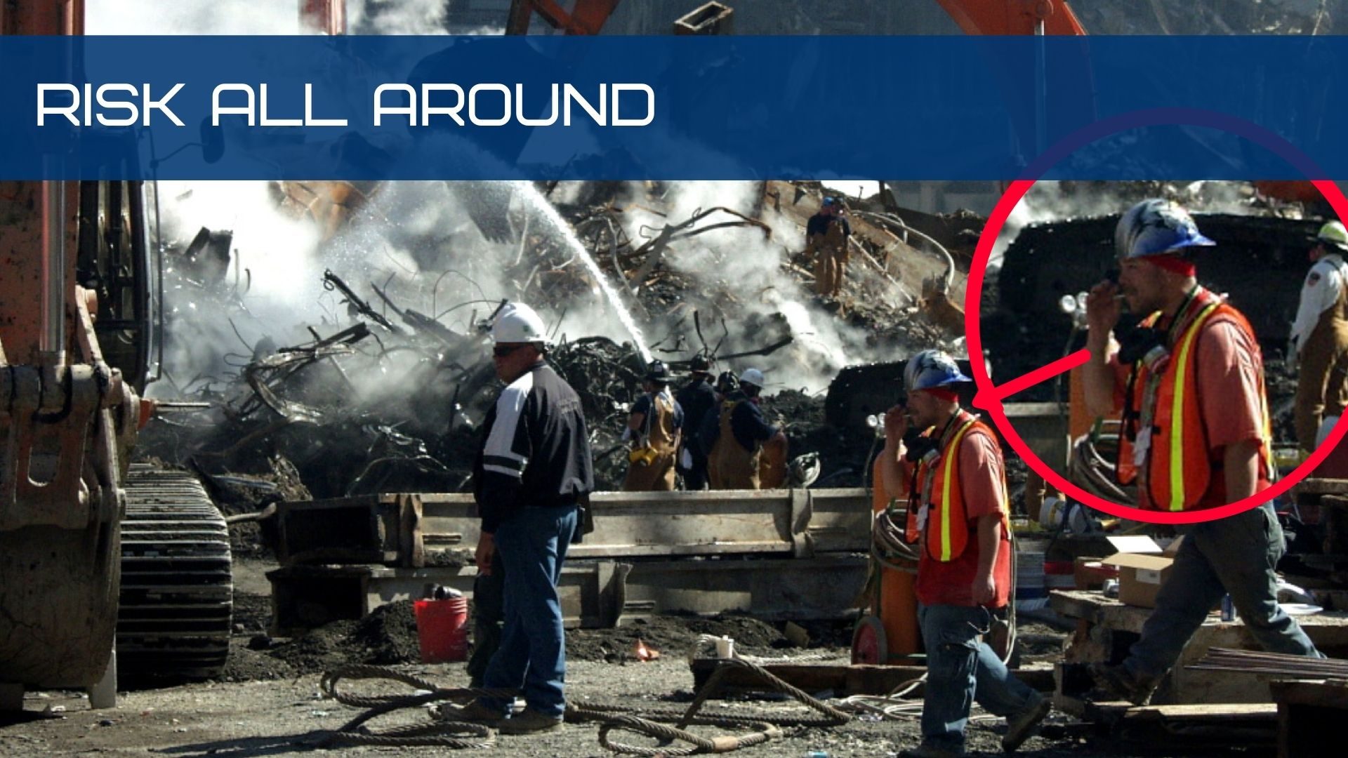 The fire rages, the dust blows, and he is not wearing a mask but smoking a cigarette.