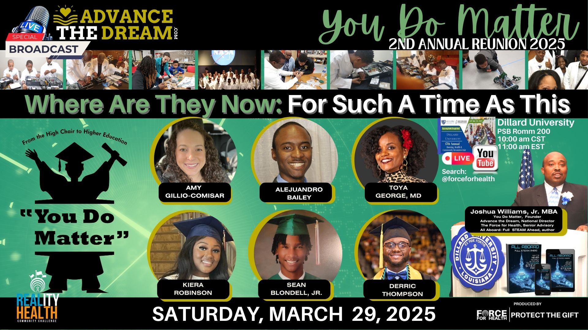 Join us LIVE with a special Advance the Dream Broadcast, LIVE from the 17th Annual Dillard Housing, Health, Community and Resource Fair as we feature a 2nd Annual Reunion called Where are They Now in Such a Time as This for You Do Matter, a Force for Health powered, multigenerational STEAM Team and mentoring program founded by Joshua Williams, Jr. MBA.