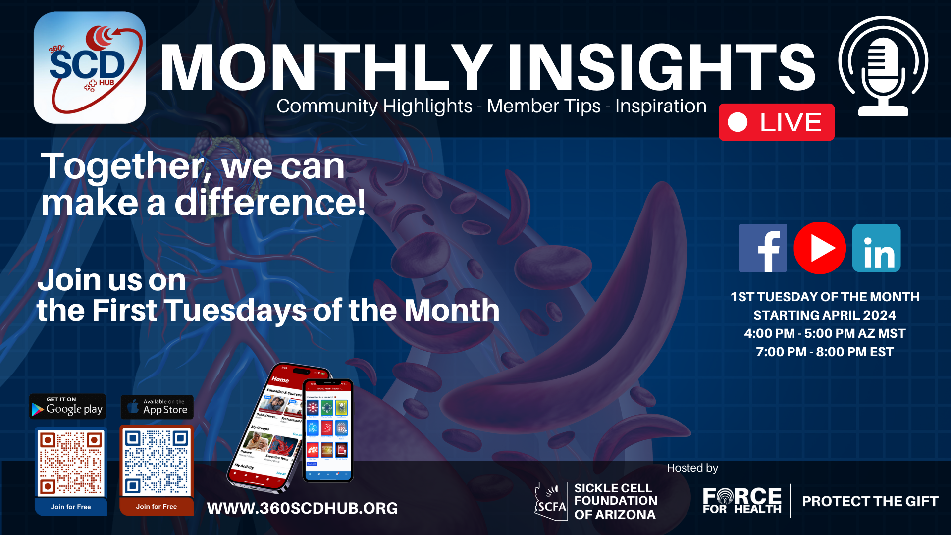 Join us on our new 360° SCD Hub Monthly Insights LIVE Broadcast, co-hosted by the Sickle Cell Foundation of Arizona and the Force for Health Network, as we dive into highlight, member tips and inspirational stories designed to educate and empower the entire ecosystem for sickle cell disease.