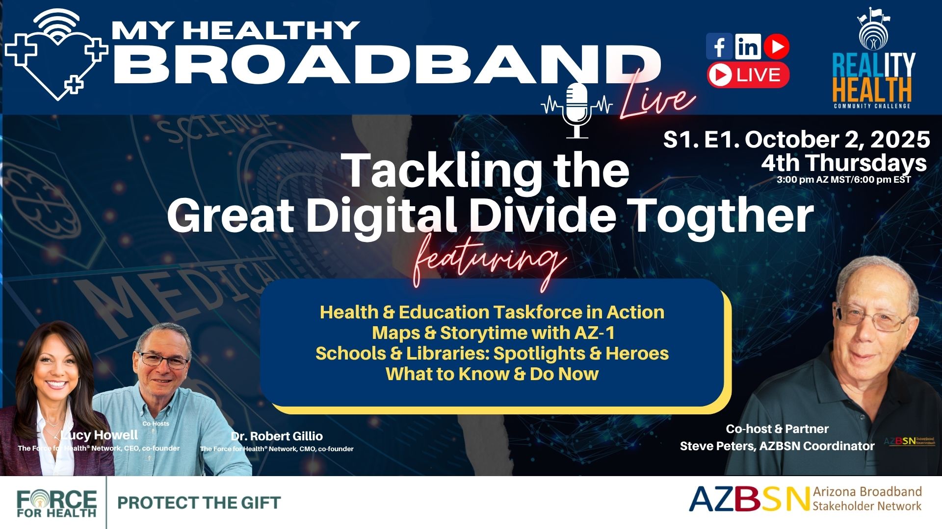 My Healthy Broadband™, produced and hosted by the Force for Health® Network, in partnership with the Arizona Broadband Stakeholders Network (AZBSN) is a live monthly series exploring how broadband access is essential for lifelong health, education, and equitable prosperity. In our premiere episode, we bring together voices from across Arizona and beyond to examine how individuals and systems are working together to bridge the nation’s persistent digital divide.