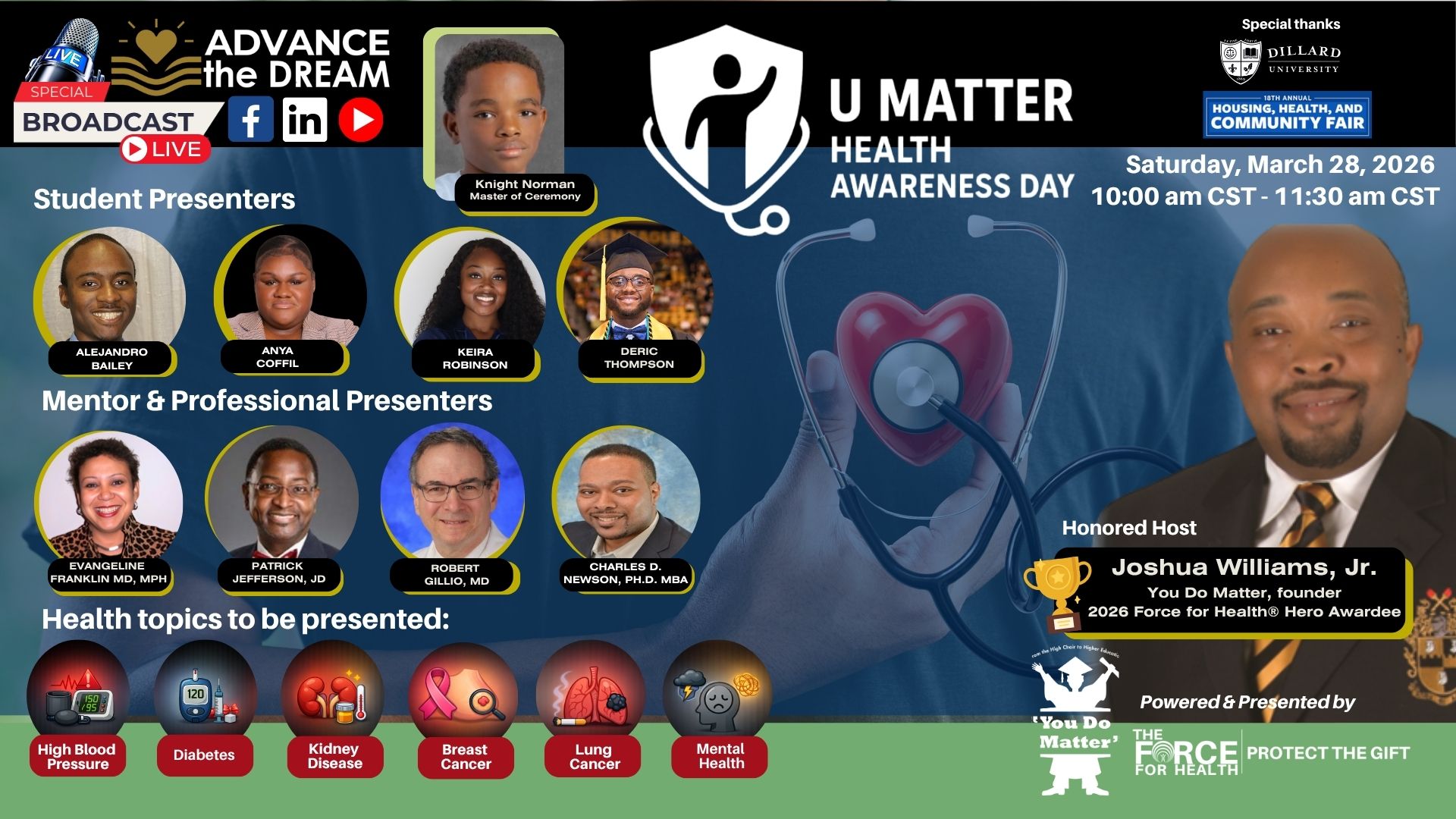Join us live from the PBS Auditorium at Dillard University in New Orleans on March 28, 2026, from 10:00 to 11:30 AM CST for the UMatter Health Awareness Day presentation—a featured event of Dillard’s 18th Annual Housing, Health, and Community Fair.