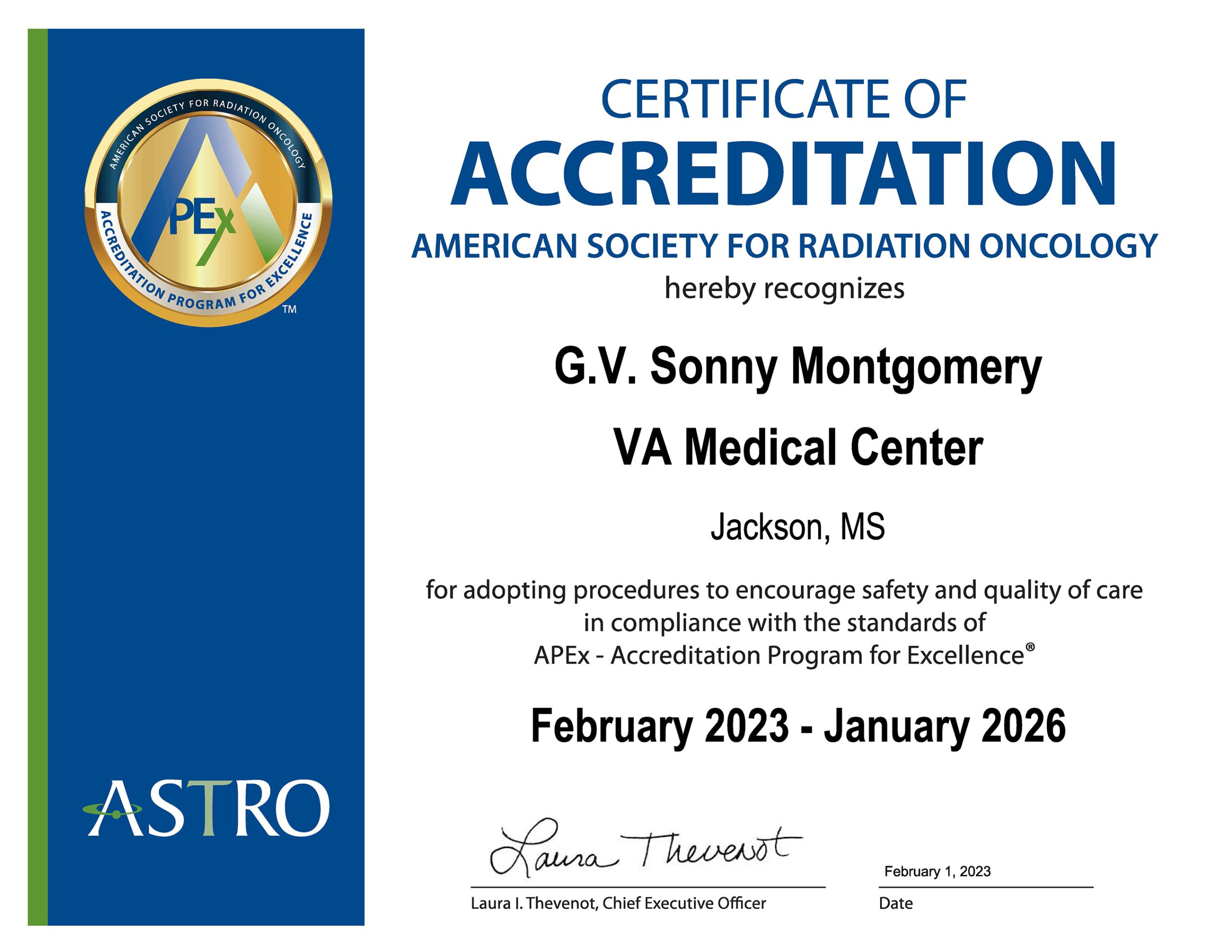 The V. (Sonny) Montgomery VA Medical Center in Jackson, Mississippi, has earned national recognition for the quality of cancer care provided to Mississippi Veterans. The medical center received the American Society for Radiation Oncology Accreditation Program for Excellence Accreditation.