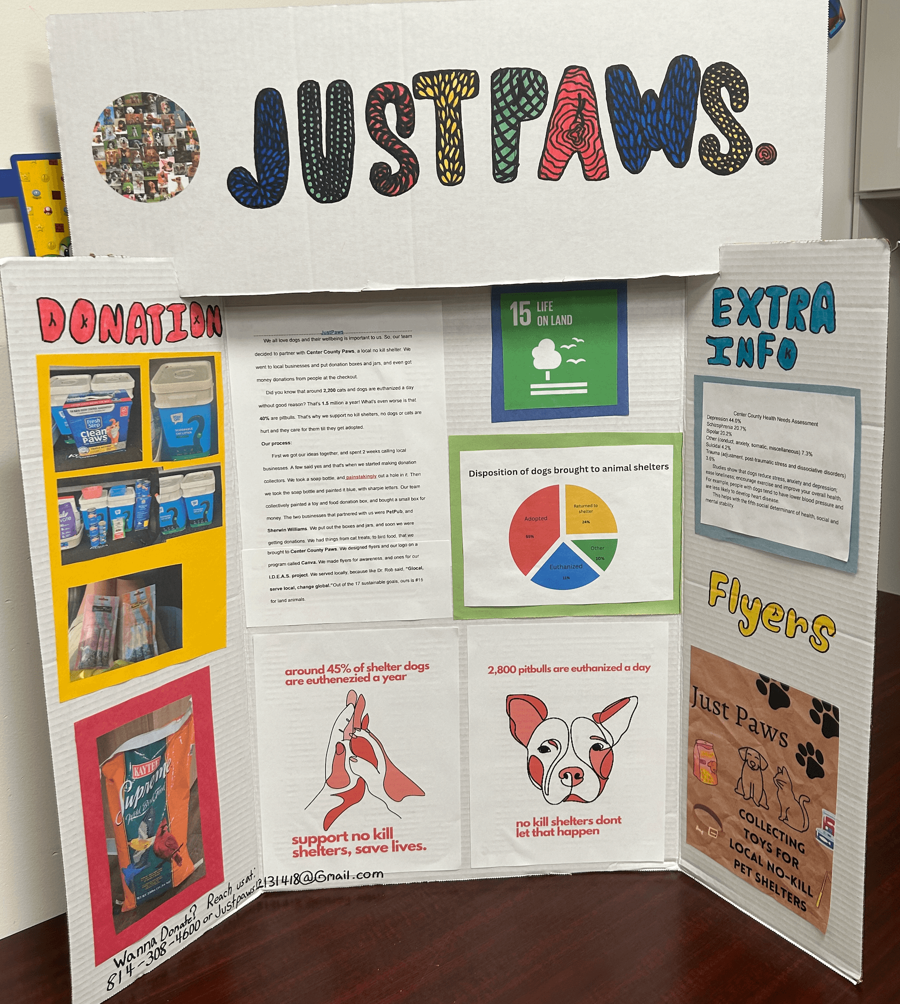 D. Design: We contacted the director of Just Paws, our local no kill shelter, and learned that they could use tools, and dollars to help their efforts. We talked to a bunch of people and figured out how to make containers to collect money, boxes to collect toys, and then get the money to Just Paws.