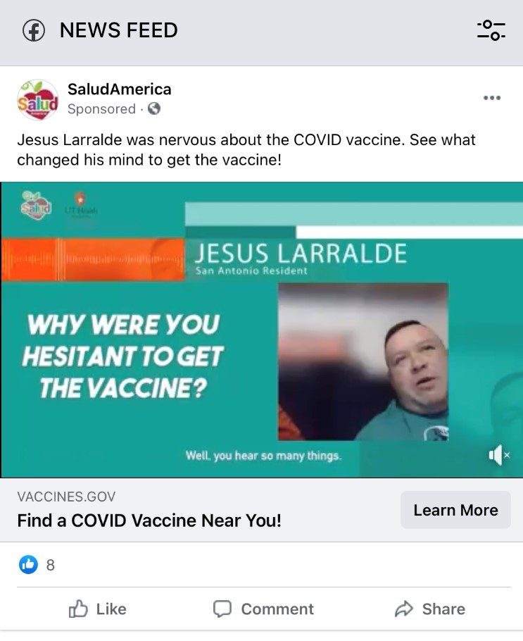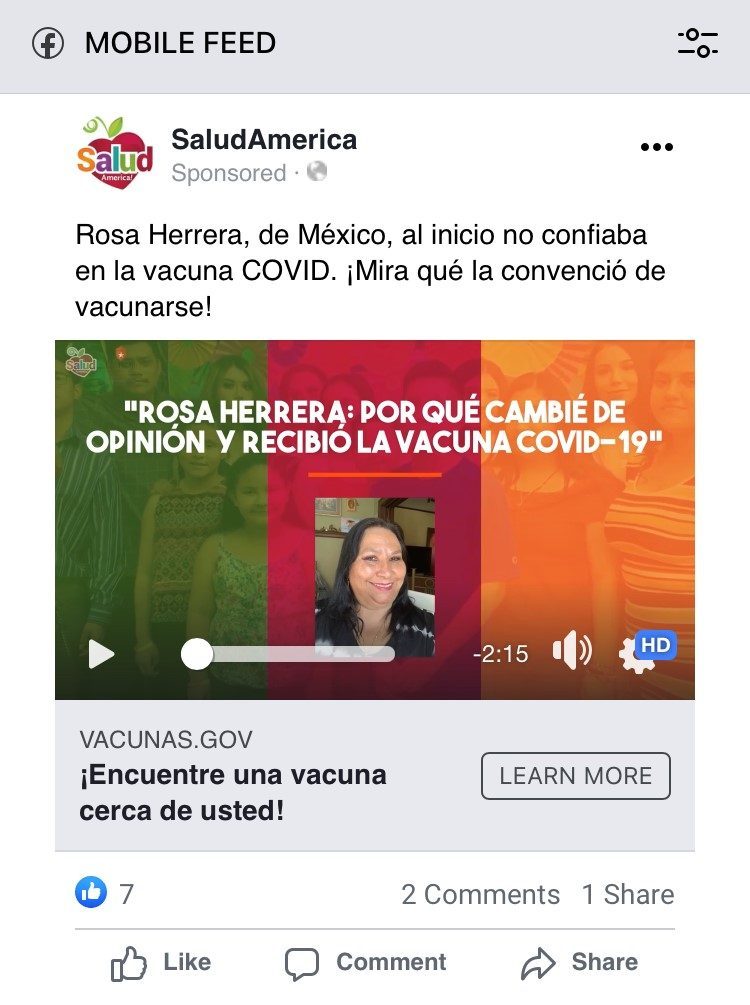 They used video testimonial ads of Latino peer role models, like Rosa Herrera, who tout the benefits of the COVID-19 vaccine, while providing psychological inoculation by acknowledging misinformation, rejecting it, and receiving the vaccine.